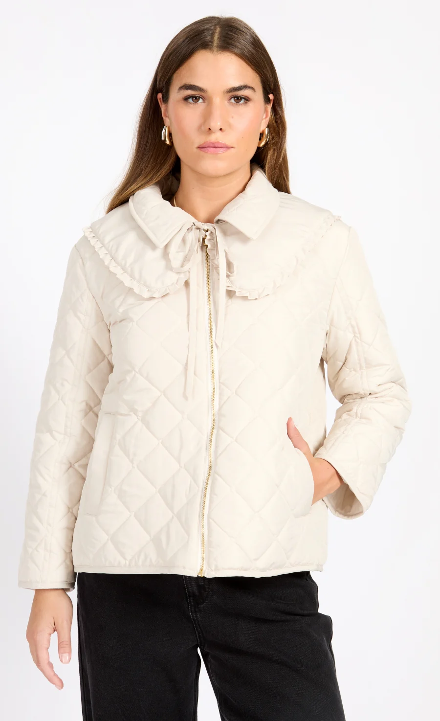 Super-cute meets super-stylish in our quilted jacket, a detachable tie-neck collar makes for an ultra-versatile piece. Style over wide leg trousers or jeans for a relaxed yet on-trend statement.